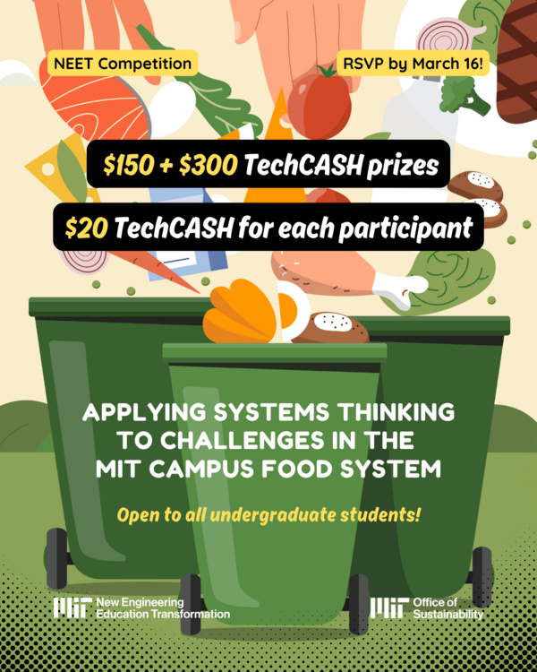Tackle a challenge related to the MIT campus food system and present your ideas using a systems thinking approach to win TechCASH in this competition hosted by the New Engineering Education Transformation (NEET) program in collaboration with the MIT Office of Sustainability.