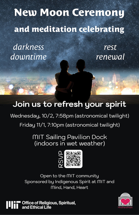 The new moon is a time of darkness, rest, creativity, and gestation. Join MIT's Indigenous Spirit Community in a centering ceremony honoring the interior quiet time needed for discernment, regeneration and incubation.