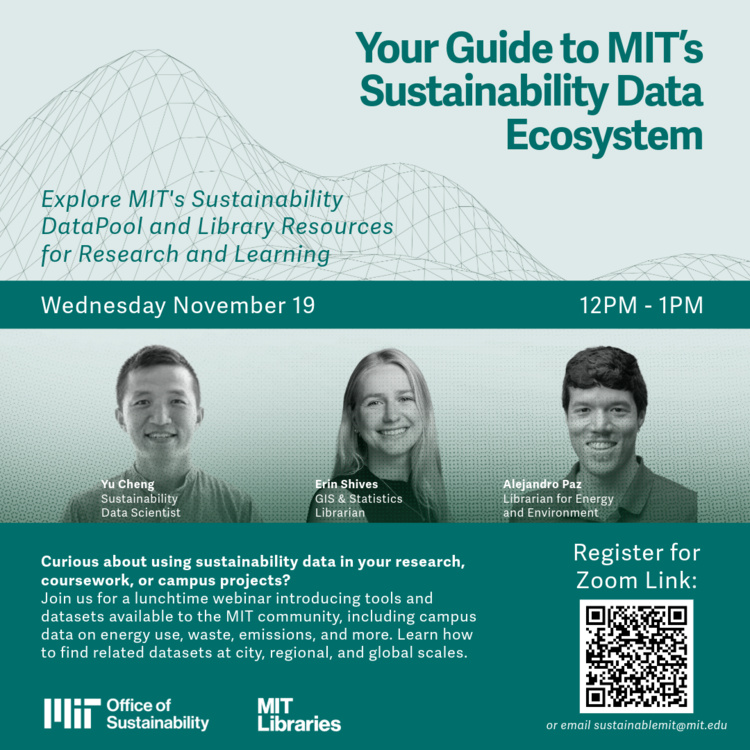 This lunchtime webinar will feature Yu Cheng (Sustainability Data Scientist), Alejandro Paz (Librarian for Energy and Environment), and Erin Shives (GIS & Statistics Librarian), who will share how to access and work with sustainability data at multiple scales, from the MIT campus to the city, regional and global contexts.